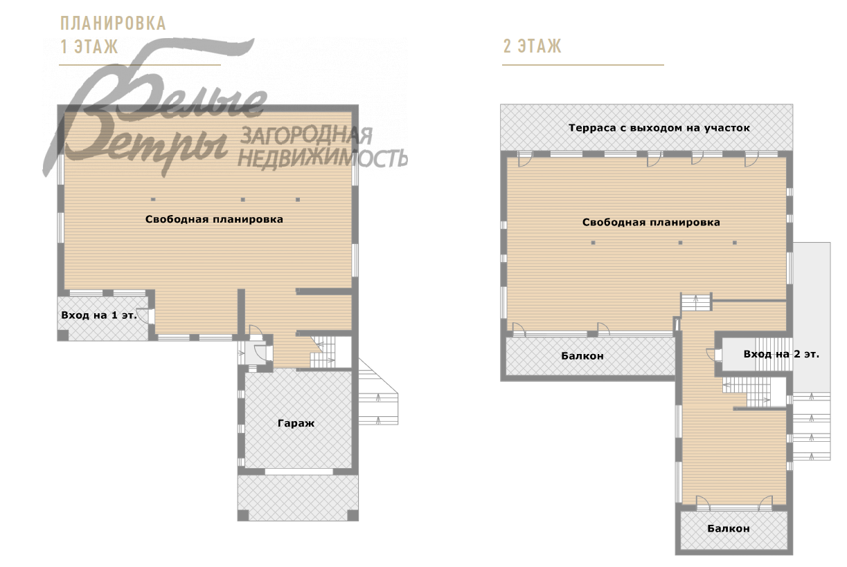 1-ый этаж: 1 этаж, частично цокольный -свободная планировка. Возможный вариант планировки: просторная СПА-зона с бассейном, сауна/хамам, душевые, санузел, котельная с отдельным входом, кладовые, гараж на 2 м/м, блок для персонала.