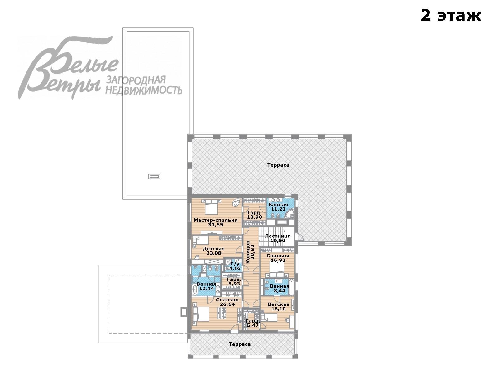 2-ой этаж: Свободная планировка: предполагается: холл 15 кв.м, мастер спальня 29 кв.м с санузлом 14 кв.м с выходом на балкон 44 кв.м, детская спальня 19 кв.м с санузлом 8 кв.м и гардеробной 4 кв.м, детская комната 29 кв.м, гостевая спальня 16 кв.м, санузел 4 кв.м, гардеробная 6 кв.м