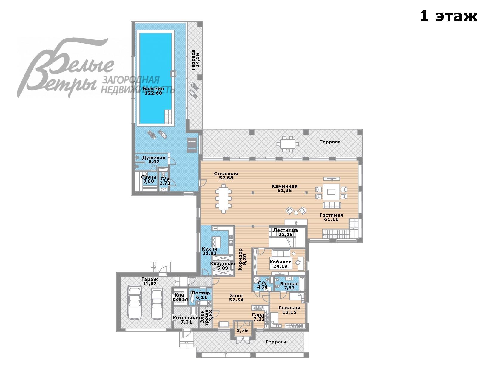 1-ый этаж: Свободная планировка: предполагается: крытая терраса 44 кв.м, тамбур, холл 29 кв.м, кухня 22 кв.м с выходом на открытую террасу, гостиная-столовая 59 кв.м с выходом на крытую веранду 44 кв.м, гостиная с камином 35 кв.м, кабинет 24 кв.м с санузлом 7 кв.м, спортзал 19 кв.м, санузел 4 кв.м, помещение бассейна 123 кв.м с сауной 7 кв.м, душевой и санузлом, гараж 43 кв.м, электрощитовая, постирочная, котельная
